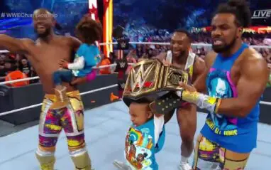 Big E had a big surprise for Kofi Kingston after winning the WWE Title. He had a box at ringside that included new New Day merch. This merch featured Kofi Kingston as WWE Champion. After Kofi won the match, Big E opened the package and presented everyone in the ring with the new t-shirt.