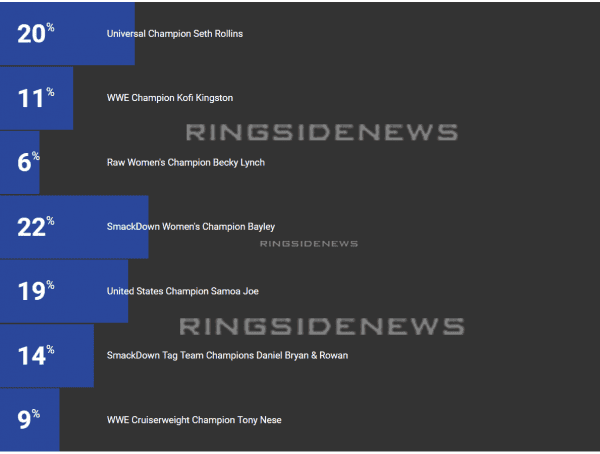 As you can see from the results below, Bayley won this poll which is one that you really didn’t want to win because it meant that more fans think she will lose. Currently, The Hugger is sitting at 22%. Seth Rollins is right behind her though with 20%.
