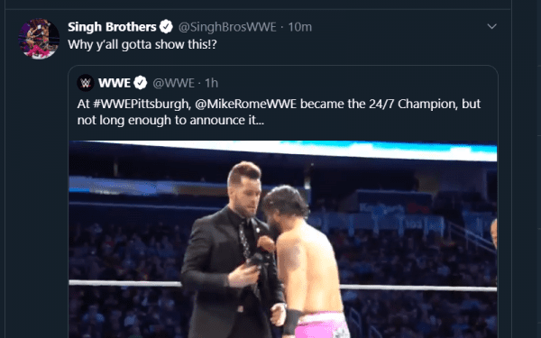 The Singh Brothers’ official Twitter account tweeted out a reply to WWE’s video of Mike Rome winning the title. “Why y’all gotta show this!?” was the question. Some fans responded to this tweet as well and it was gaining traction.