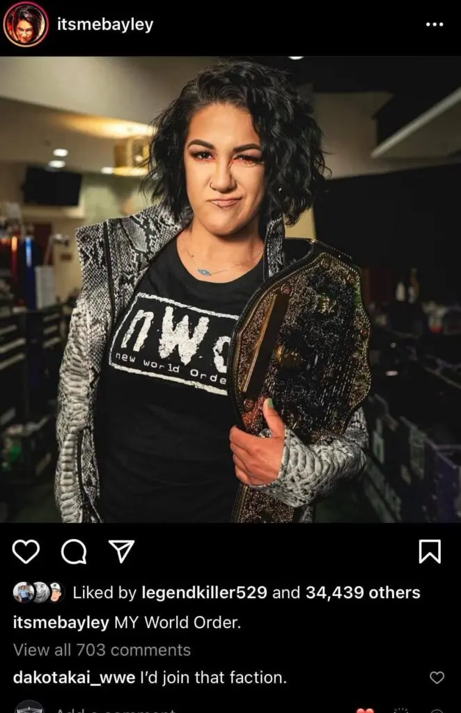 Bayley tweeted out a photo of herself clad in nWo gear. This drew some fast attention on Instagram. Then Dakota Kai commented to say: “I’d join that faction.” That is very interesting, but there could be more to this as well.