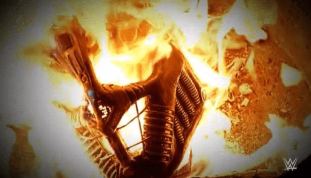 WWE aired a vignette during NXT Halloween Havoc tonight. The video package showed a person throwing what appears to be T-Bar’s retribution mask in the fire and watching it burn.