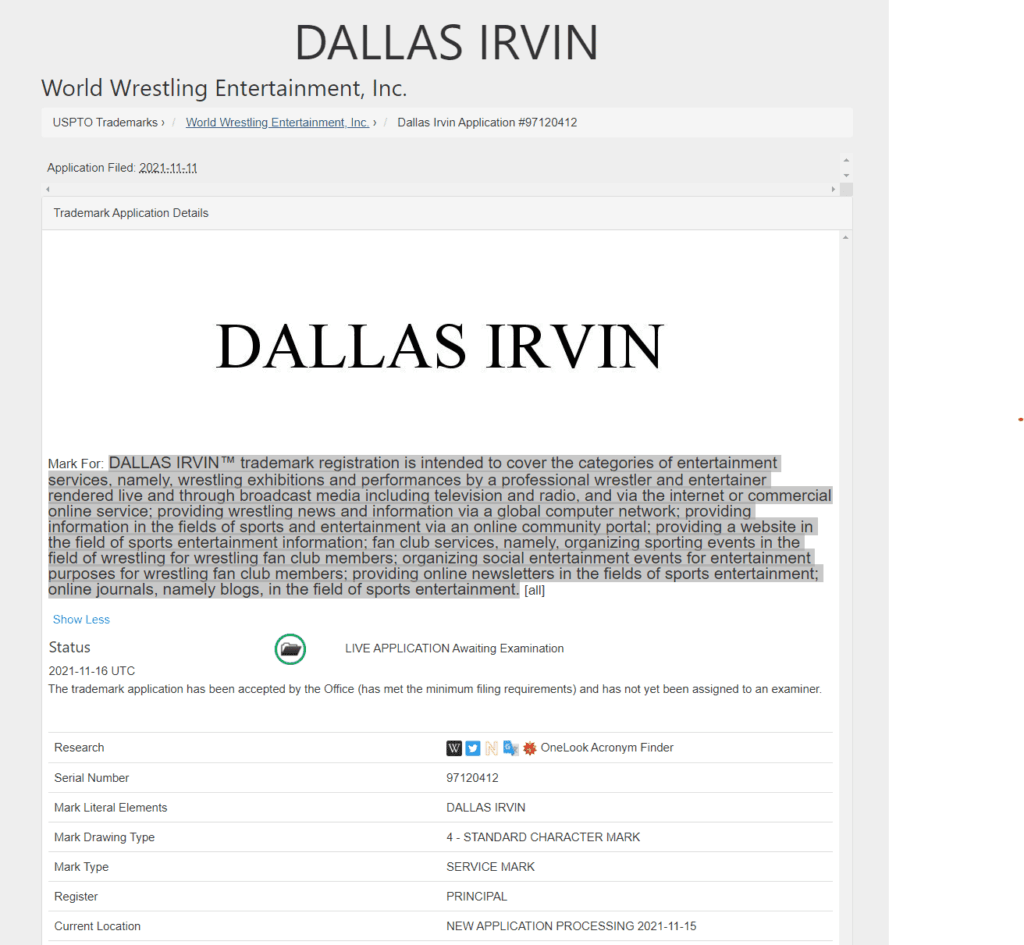 “DALLAS IRVIN™ trademark registration is intended to cover the categories of entertainment services, namely, wrestling exhibitions and performances by a professional wrestler and entertainer rendered live and through broadcast media including television and radio, and via the internet or commercial online service; providing wrestling news and information via a global computer network; providing information in the fields of sports and entertainment via an online community portal; providing a website in the field of sports entertainment information; fan club services, namely, organizing sporting events in the field of wrestling for wrestling fan club members; organizing social entertainment events for entertainment purposes for wrestling fan club members; providing online newsletters in the fields of sports entertainment; online journals, namely blogs, in the field of sports entertainment.”