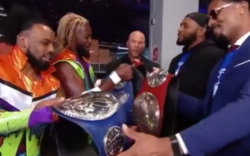 Adam Pearce gathered The Street Profits and New Day backstage after it was revealed that Montez Ford and Angelo Dawkins are headed to SmackDown. He suggested that they simply switch titles.