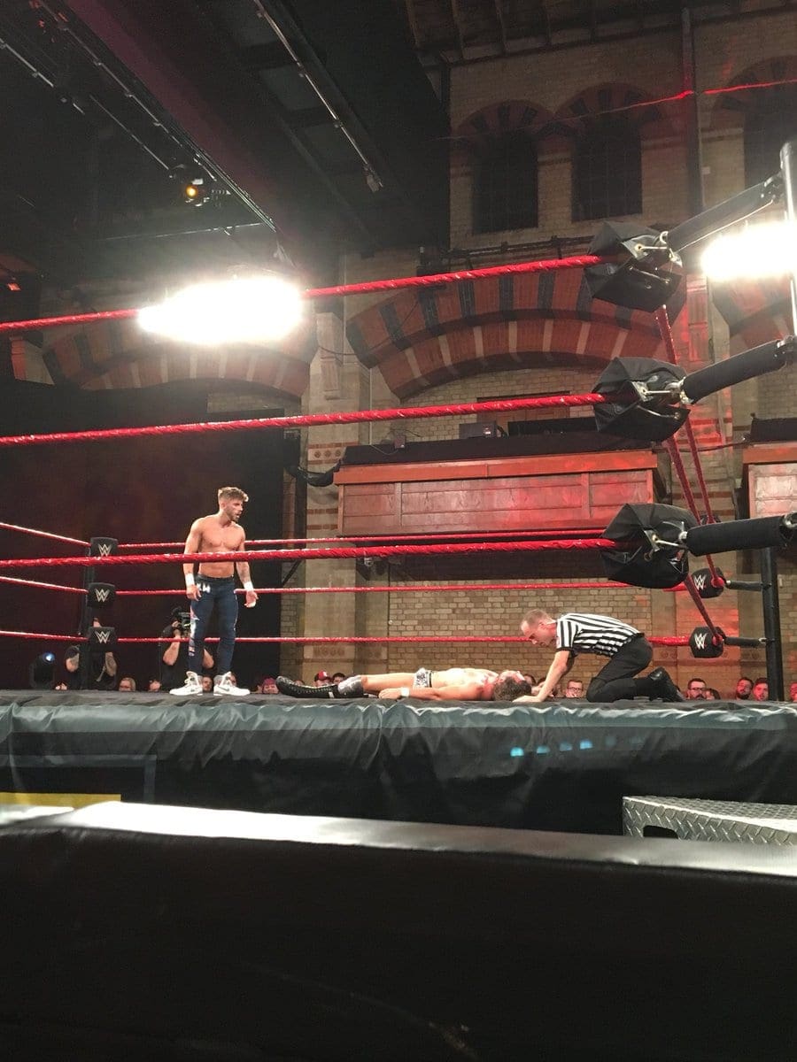 As noted earlier, WWE is at the Corn Exchange in Cambridge, England to tape it’s first set of television tapings today and tomorrow for the upcoming NXT UK series. Unfortunately there was an injury at the event and one of the matches had to be stopped.
