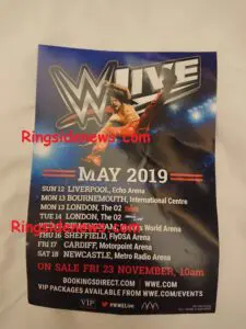 During the live events this week, WWE was passing out a flyer promoting their next scheduled tour dated in the UK market. As you can see by the flyer sent to us by a reader, Raw and SmackDown Live will be pre-taped in London’s O2 Arena on May 13th and 14th next year.