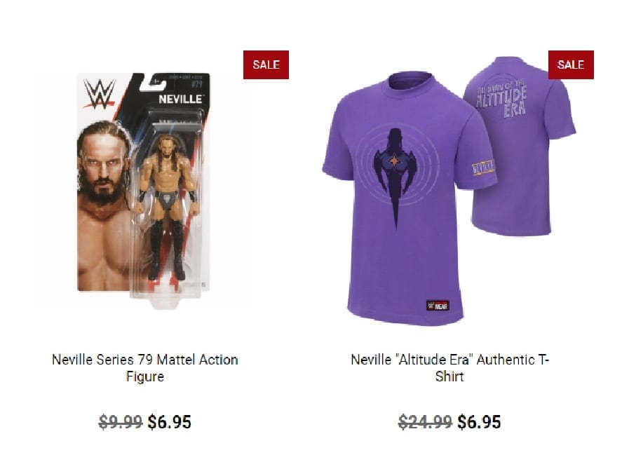 Also, if you’ve been meaning to pick up a basic Mattel Neville action figure, there doesn’t seem to be any better time than now either because they’re on clearance too. This isn’t a good situation for WWE’s shop to be in, but it might be even worse for Neville — if he’s still receiving royalty checks they can’t be very much with these prices.