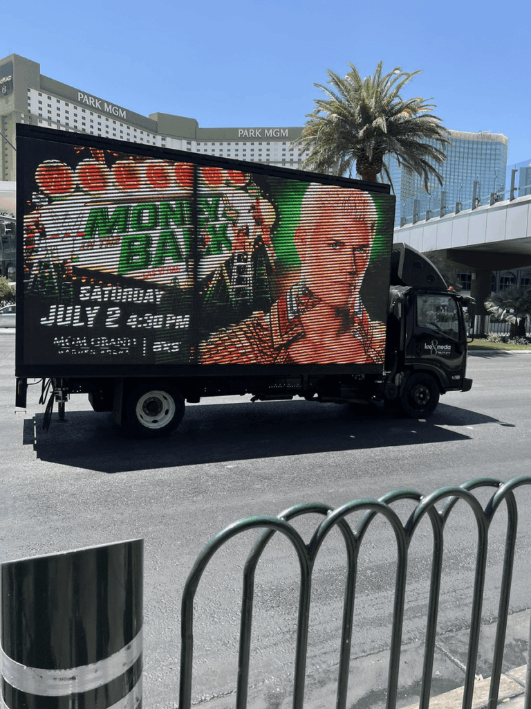 WWE likes to market to people in their demographic. They were obviously ready for Double or Nothing, because it appears they hired out a rolling billboard to plug Money in the Bank in front of the T-Mobile Arena.