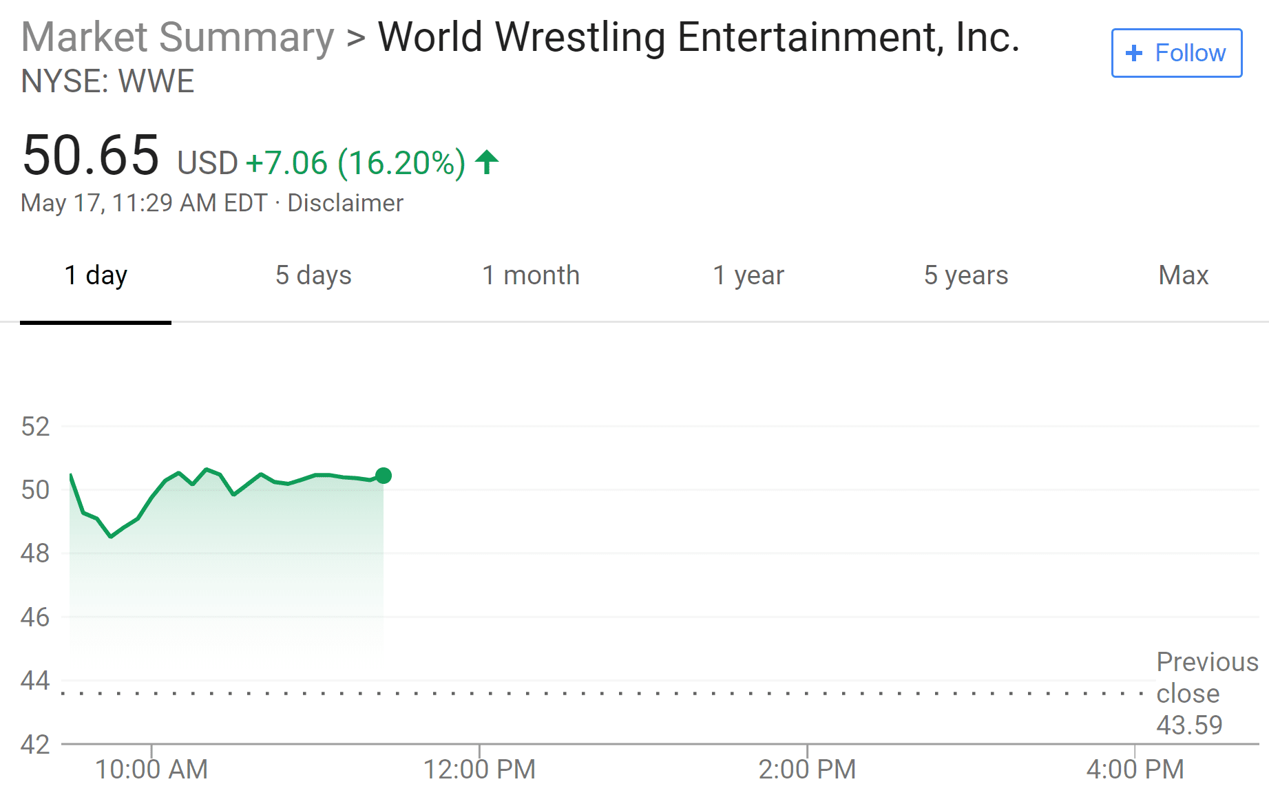 WWE stock has passed the $50 mark for the first time ever this morning. The belief is that the rumors of NBC Universal deal of RAW possibly tripling in value could have contributed to the surge.