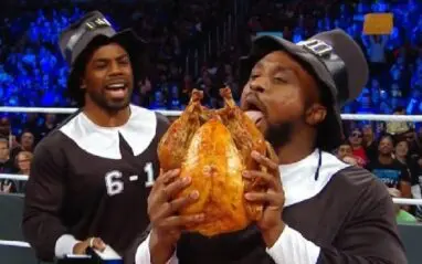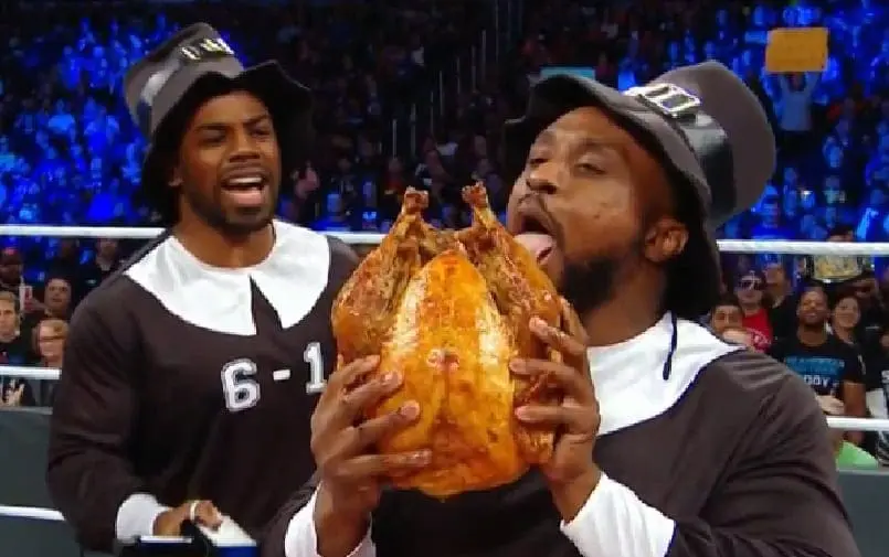 But on SmackDown Live, before their Thanksgiving Feast Fight with The Bar and Big Show, the longest-running Tag Team Champions in WWE history were dressed as pilgrims which was appropriate attire considering the holiday. Except, Woods had “6-1” written on his shirt.