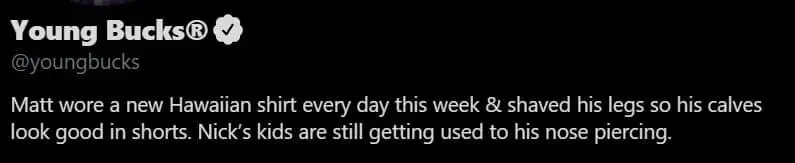 The Young Bucks updated their Twitter bio once again, the only real way they put messages out on the platform. This time they addressed Matt Jackson’s Blood & Guts attire. They also said that Nick’s kids are getting used to his new nose piercing.