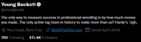 If the teams meet at Double or Nothing, it will be the biggest stage they’ve ever competed against one another on. The Young Bucks recently poked the bear in their unique way. Their most recent Twitter profile update notes that The Hardys are the only team to have ever earned more than the Young Bucks.