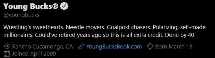 The AEW World Tag Team Champions’ new Twitter bio is very interesting. They changed their bio to reflect that they are not happy with the way that pro wrestling is going right now and they plan to be “done by 40.”