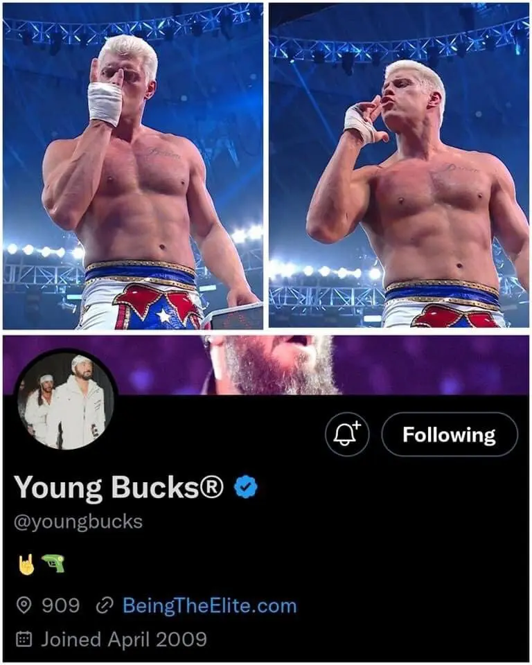The Young Bucks took to Twitter to address Cody Rhodes’ shout-out from the Royal Rumble. Matt and Nick Jackson reacted to the special moment in their Twitter bio. They didn’t say anything outright, but those two emojis they picked certainly sent the message home.