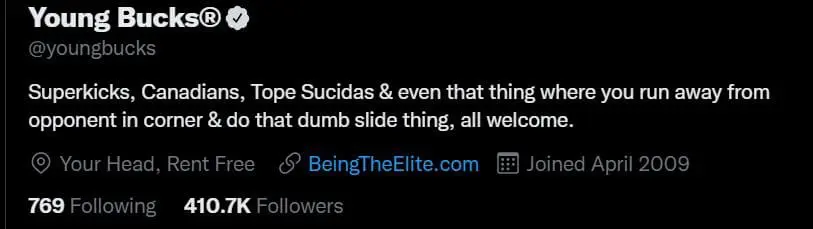 Even The Young Bucks joined the fans in trolling CYN’s set of rules. The Bucks, who are know for their flashy move set and high-flying maneuvers in the ring, changed their Twitter bio to mock Control Your Narrative’s Rule No. 5. They also included two things of their own.